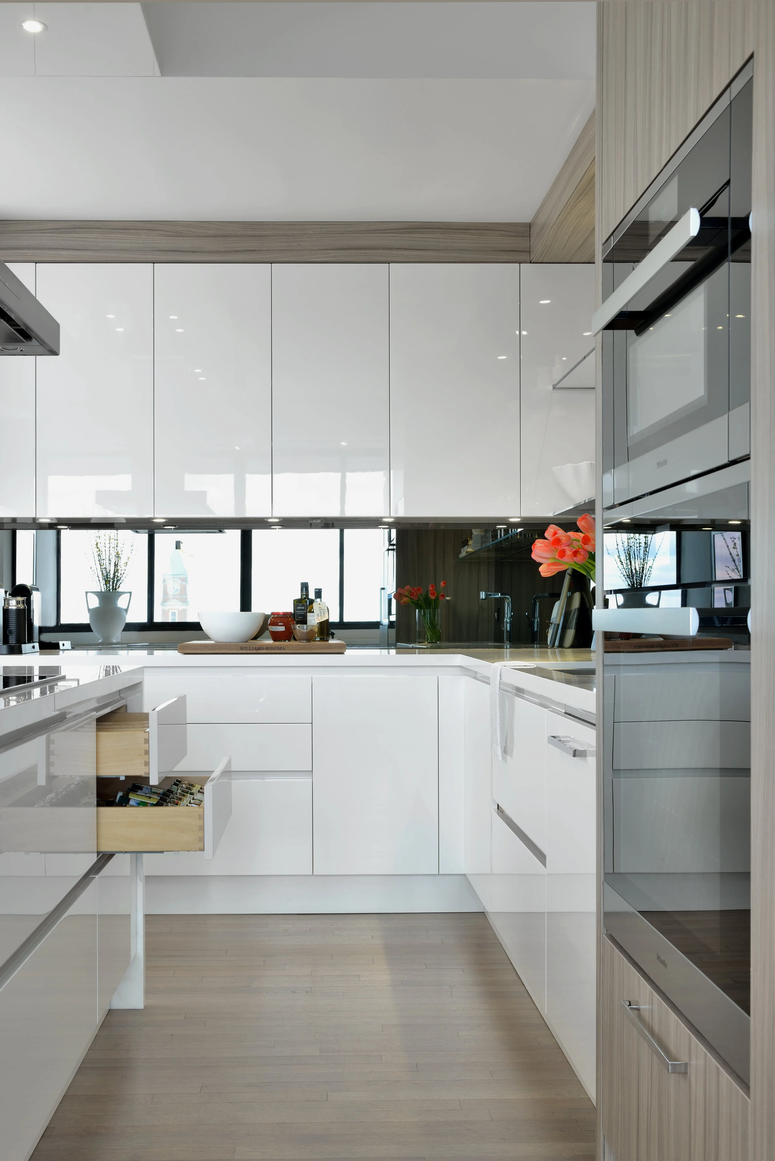 ALL THE DRAWERS IN THIS KITCHEN ARE EQUIPPED WITH SERVO-DRIVE TECHNOLOGY WHERE THEY AUTOMATICALLY SPRING OPEN WHEN PRESSED, WHICH MEANS THE CHEF CAN OPEN THEM WITH THEIR KNEES WHEN THEIR FINGERS ARE HOLDING A HOT POT OR STICKY. WE ALSO LOVE THE TABLE OFF THE ISLAND WITH BUILT-IN LIGHTING THAT WE DESIGNED.