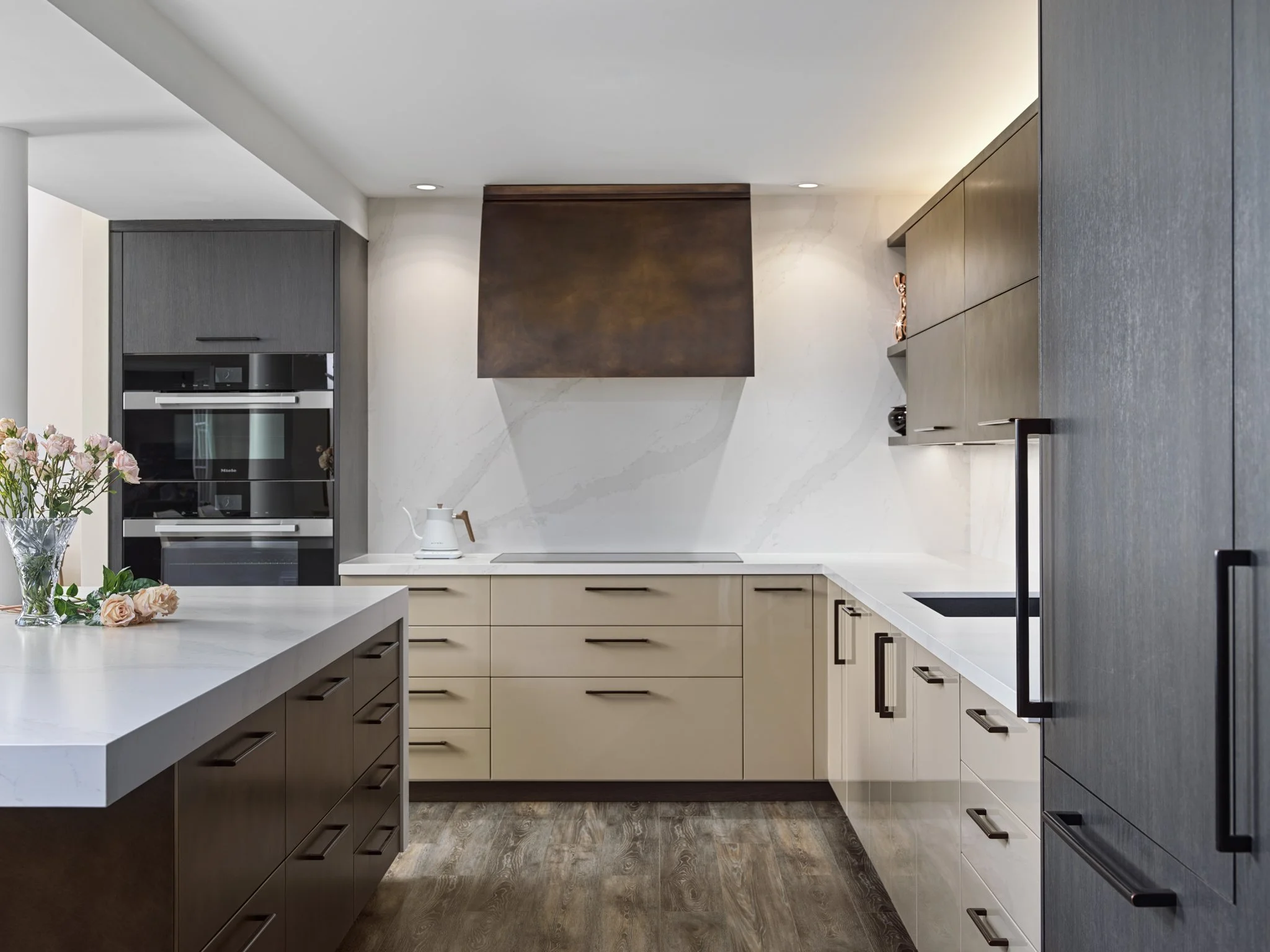 BRONZED, HAND-RUBBED STEEL DOORS MAKE A STATEMENT IN THIS DRAMATIC MODERN KITCHEN. ACCENTED WITH HANDSOME HIGH-GLOSS LACQUER DOORS AND A CLASSY EUROPEAN TEXTURED MELAMINE.