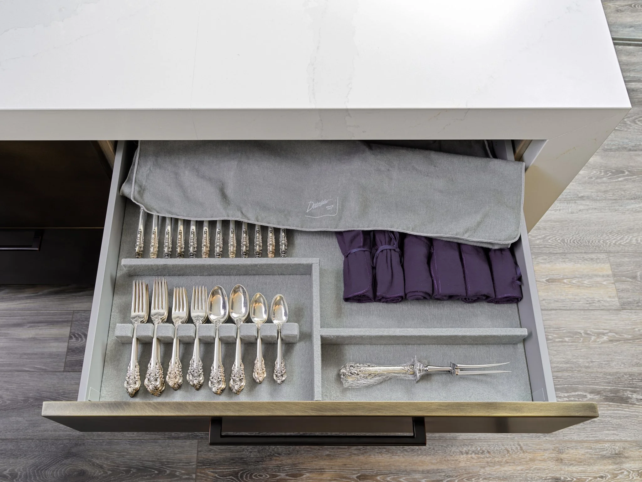 CUSTOM-FITTED PULLOUTS TACTFULLY PLACED WITH PREMIUM FELT SILVERWARE PROTECTORS - SOME OF THE MANY CUSTOM DETAILS IN THIS FINE KITCHEN