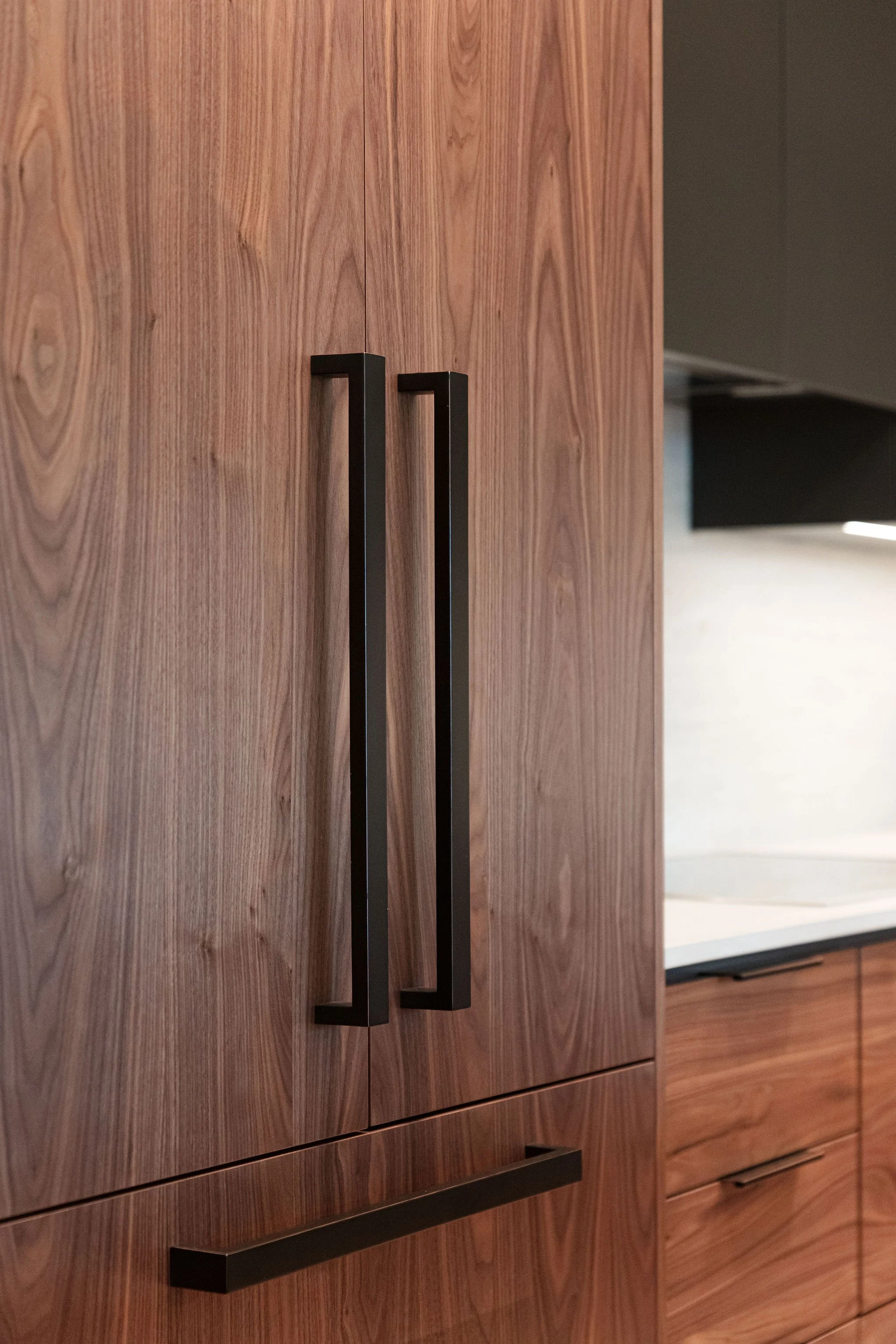 NATURAL WALNUT VENEER DOORS WITH A STRIKING HORIZONTAL GRIAN-MATCH DETAIL, PAIRED WITH ATELIERS JACOB’S EXCELLENT LACQUER FINISH MADE TO LAST GENERATIONS.